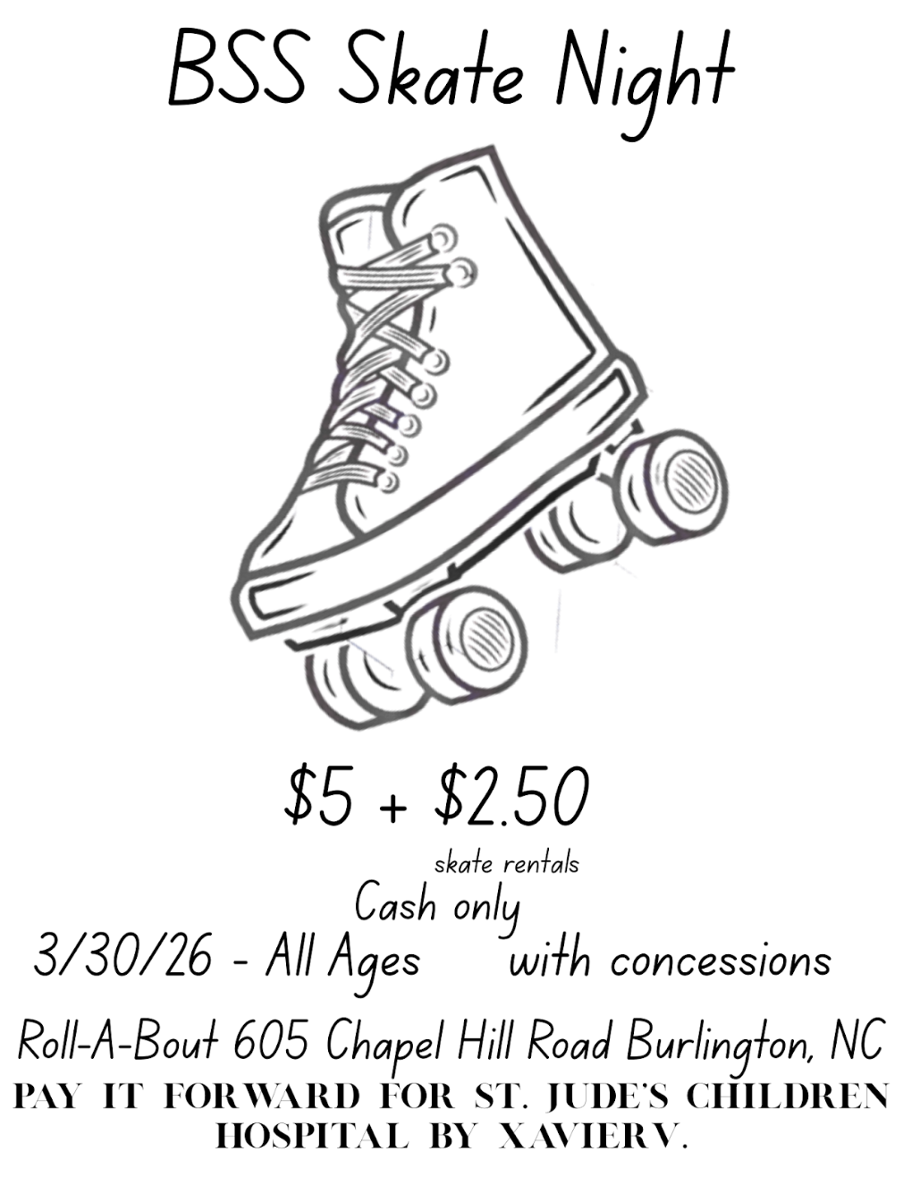 Monday, March 30 - Skate Night-A Pay It Forward Project @ Roll-A-Bout Skating Center (605 Chapel Hill Rd., Burlington, NC) from 6-8 pm 🛼