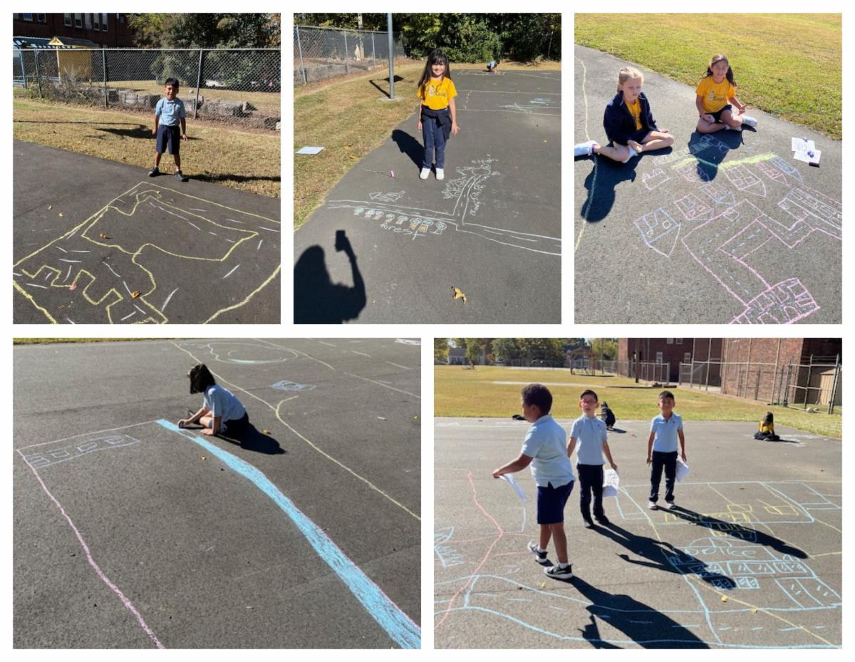 Mrs. Kearney's 2nd Grade students are learning about community life and geography, as outlined in our standard of instruction for social studies, and went outside to draw their community! Here are the pictures:
