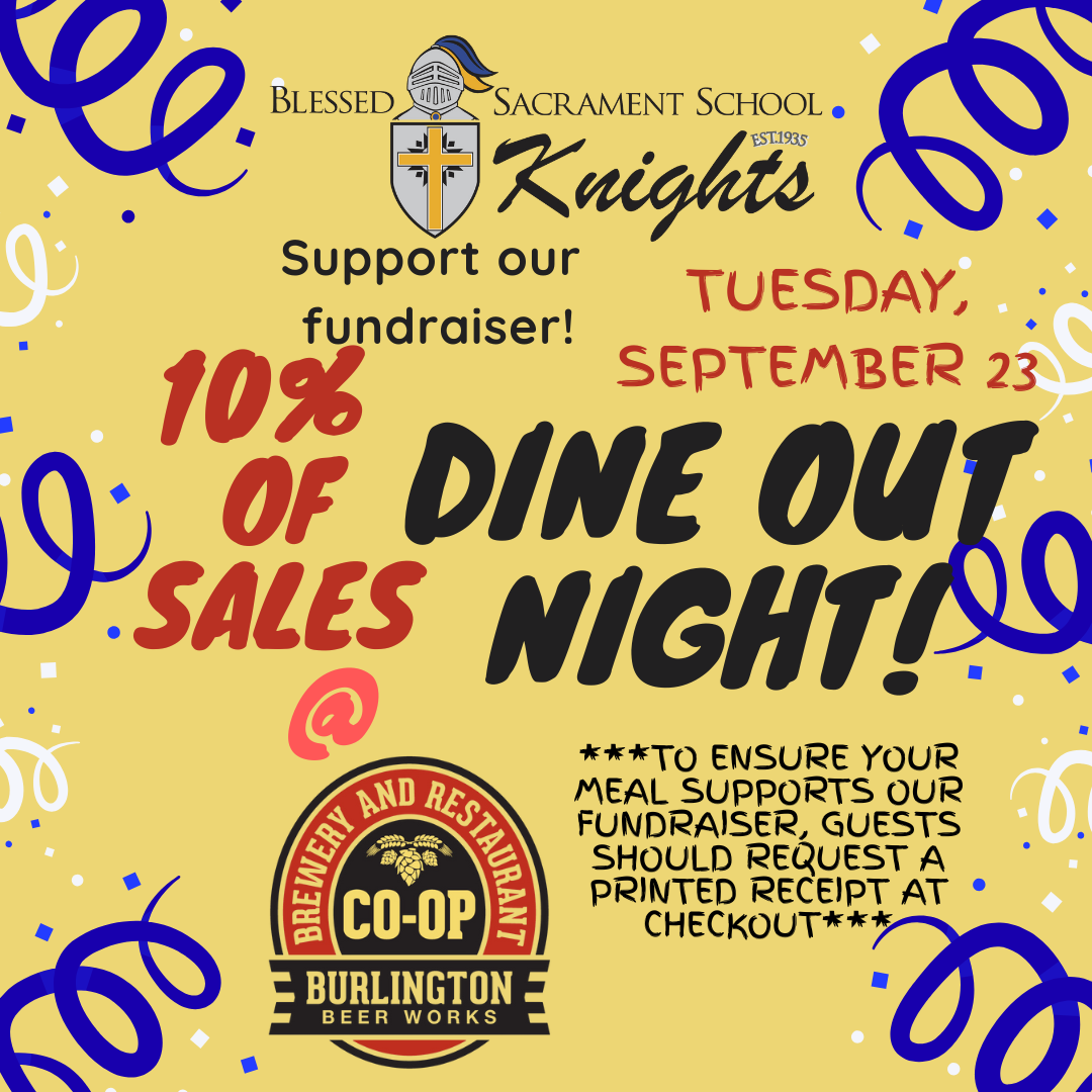 El martes por la noche es Noche de Escuela en Burlington Beer Works. El 10% de las ventas de comida generadas durante la cena se destinará a una escuela del condado de Alamance, y el próximo martes 23 de septiembre será la Noche de Blessed Sacrament School. Queridas familias de BSS, ¡por favor, vengan y apoyen!