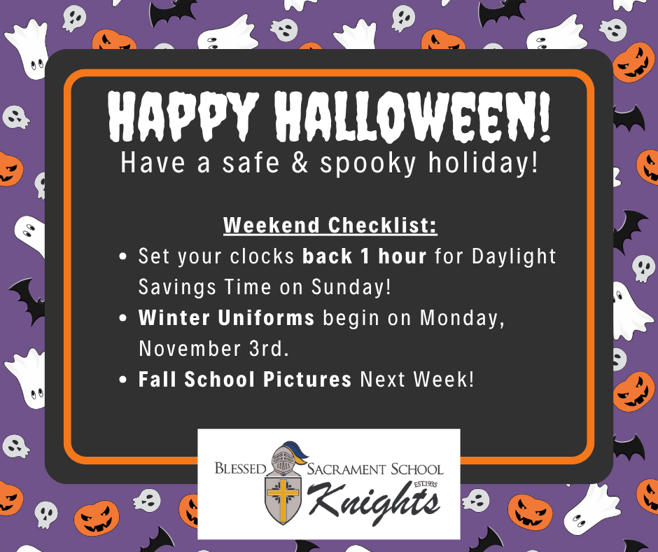 Friday, October 31 - Halloween Parade at 10:00 am-students may wear their costumes to school; Class Parties Little Knights @ 10:00 am & Elementary-MS-1:45 pm! 🎃