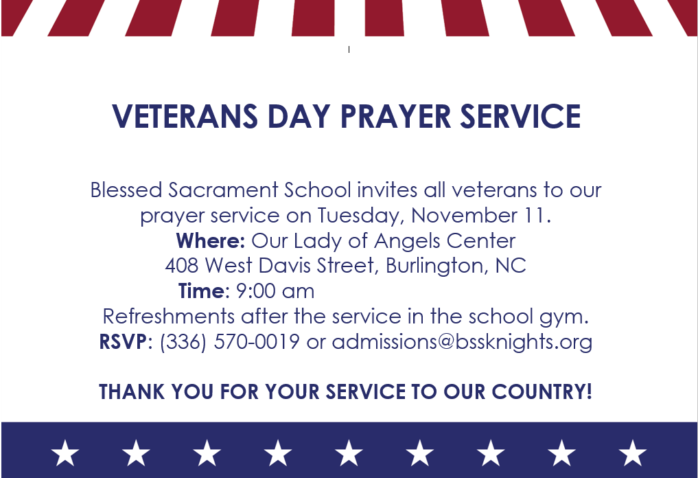 Let the office know at 336-570-0019 or send us an email at admissions@bssknights.org if you are a veteran and are planning to come. We will have coffee and donuts for you.