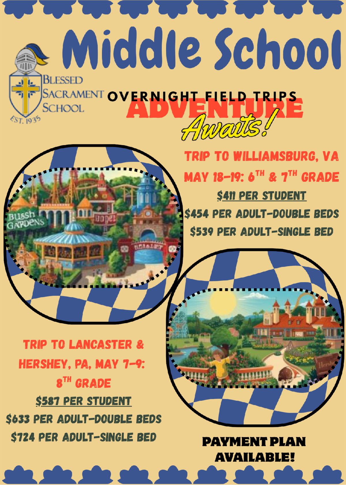 Our 8th-grade students will have an opportunity to travel to Lancaster and Hershey, PA, which will take place on May 7-9, 2026. CLICK HERE to access the draft itinerary for the 8th-grade trip.