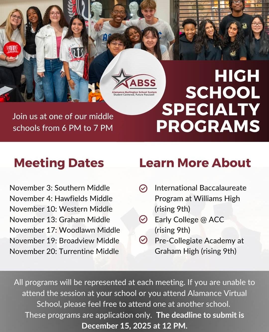We're proud of our High School Specialty Programs, and we'd love for you to attend our in-person meetings to learn more about them! You can attend any session. Applications open on November 3rd and close on December 15th. You can also learn more about these programs on our High School webpage: https://www.abss.k12.nc.us/o/abss/page/high-school