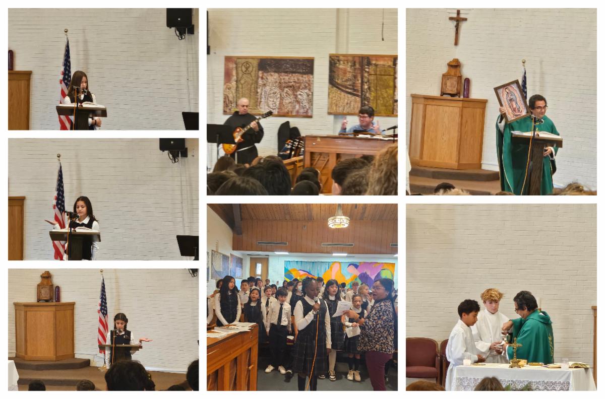 Today, Friday, November 14, we gathered for mass at 8:30 am. Fr. José shared insights with our students about the ancient civilizations of Mexico and South America, focusing particularly on the Aztecs. Did you know that the image of Our Lady of Guadalupe on a tilma has a symbolic link to Aztec beliefs? The Aztecs interpreted this image as a depiction of the Virgin Mary as a mother to a "child sun god" (represented by the four-petaled flower over her womb), who is considered the source of life. She is depicted standing on a crescent moon, which signifies her superiority over the Aztec moon god, whom she overcomes. Additionally, the image is surrounded by sun rays, symbolizing her role as the "Mother of Light" and her greater status compared to the Aztec sun god, Huitzilopochtli.
