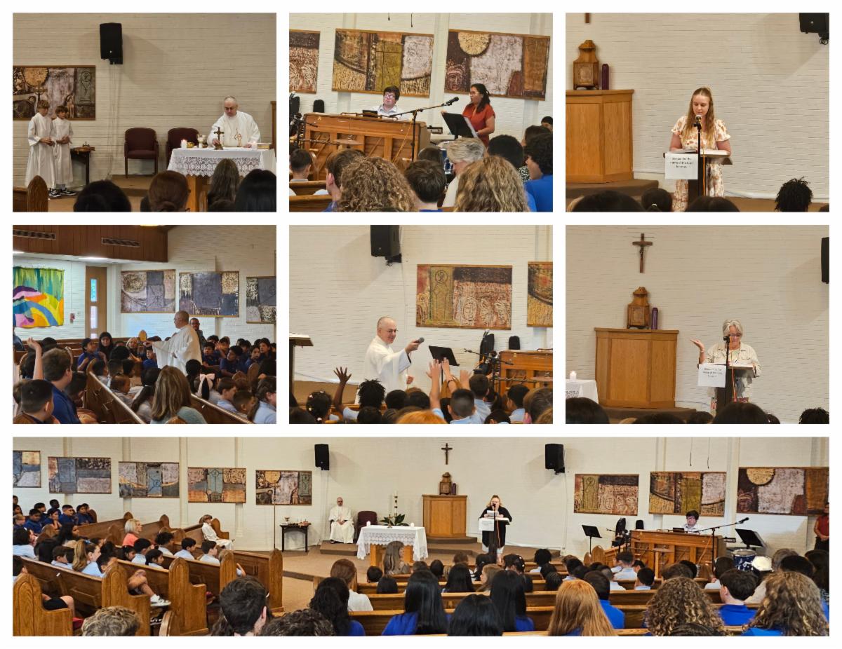 Today, Friday, August 22nd, we celebrated our first school mass of the 2025-2026 school year. Fr. Vincent talked to our students about the Virgin Mary. Did you know that she was around 14 years old when the Angel Gabriel went to visit her? Fr. Vincent told students that they can pray to Mary for help with their studies this new school year and that God wants us all to feel joy becuse He loves.