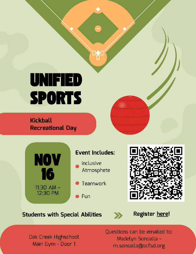 Join us for our second Unified Sports K-12 Recreation Day! We will be hosting a Kickball Event on Sunday, November 16th, 2025 from 11:30 AM - 12:30 PM in the OCHS Main Gym. This is an event for Students with Special Abilities to have the opportunity to come and play kickball with OCHS Students who are apart of Unified Sports Club. Please complete the sign up form by 11/10/2025 so we can get a headcount for the event. We hope to see you all there! If you have any questions, please feel free to reach out to Madelyn Sonsalla, at m.sonsalla@ocfsd.org.
