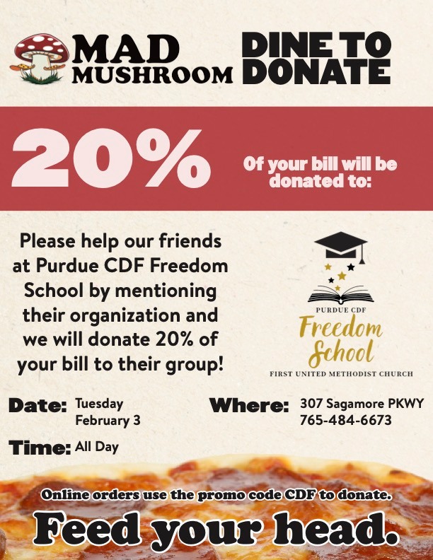 Support Purdue Freedom School at First Church at the Mad Mushroom Dine to Donate event on Tuesday, February 3!