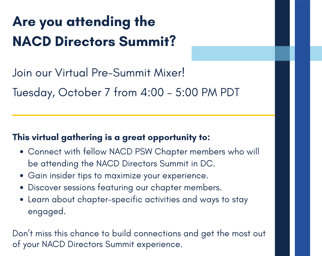 On the National front, we look forward to seeing many of you at the NACD Directors Summit in Washington, D.C., on October 12–15. This annual event is a premier opportunity to connect with directors and thought leaders from across the country.
