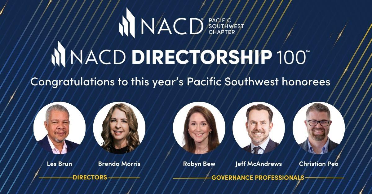 Congratulations to our local honorees, including NACD PSW Chapter Director Brenda Morris, Leslie A. Brun, Robyn Bew, Jeff McAndrews, and Christian Peo!