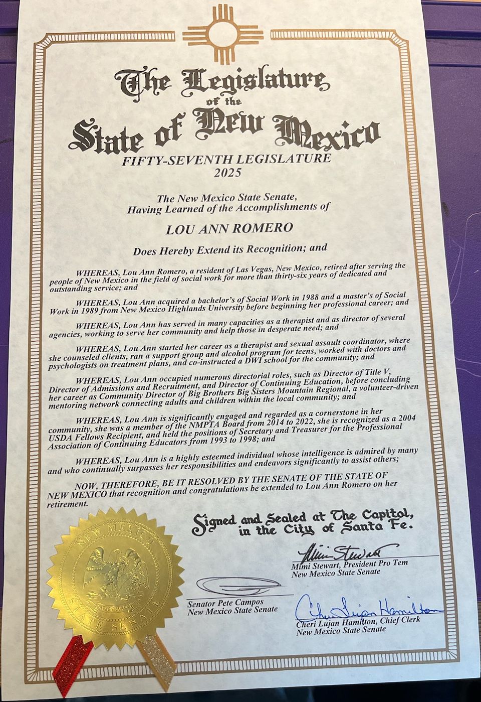 | | FORMER NMPTA BOARD MEMBER RECOGNIZED BY STATE SENATE | LouAnn Romero, former NMPTA Board Member, was recognized and congratulated by the New Mexico State Senate on her retirement from over 36 years of social work service. | | 2026 MILITARY CHILD OF THE YEAR AWARDS | |
