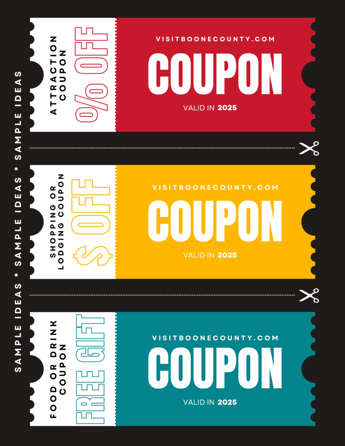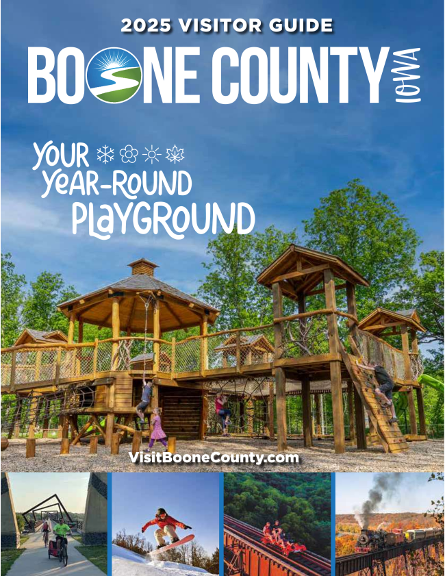 BCCVB is producing a brochure with a coupon page for 2025.This brochure will be placed in local hotels, area attractions, community businesses, Welcome Bags (see more about Welcome Bags below), and mailed to anyone requesting info about Visiting Boone County, IA.
