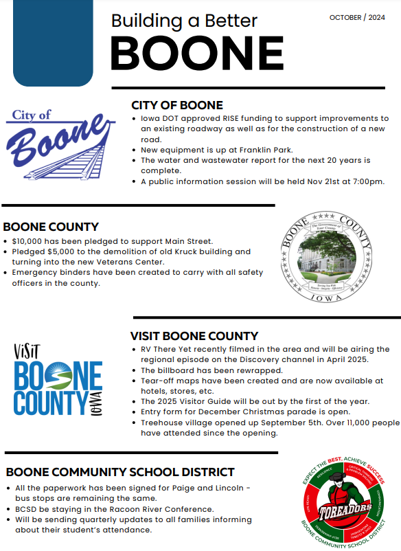 Thank you for investing in Boone County Tourism and for making Boone County one of the GREAT destinations in the state of Iowa!
