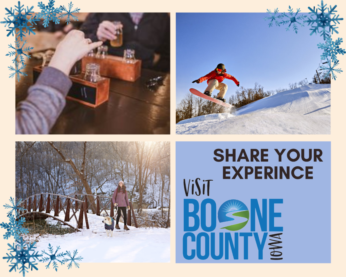 Each quarterly newsletter we'll feature new "Share Your Experience" topics where we invite individuals or businesses to provide photos or videos of places related to our featured topics in Boone County, IA. The pictures &/or video shorts will be featured to help showcase tourism for Visit Boone County, IA &/or Travel Iowa. It's a great way to promote your business as a tourism highlight in Boone County!