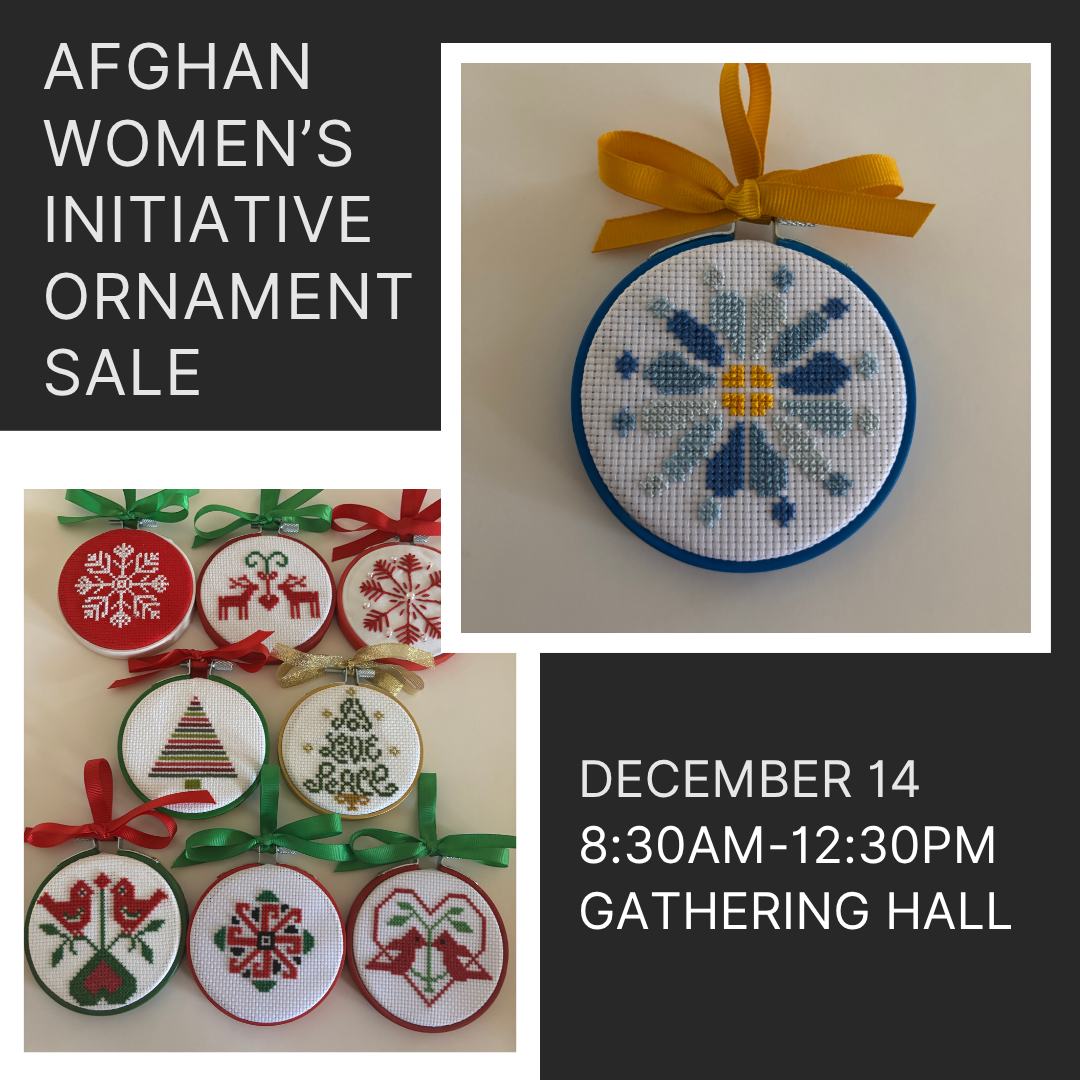 Celebrate the holiday season on December 14th in the Gathering Hall, with a festive Holiday Ornament Sale featuring embroidered works of art stitched by women from the Afghan Women's Initiative, a group of women who were part of refugee families who came to Little Rock in 2021.