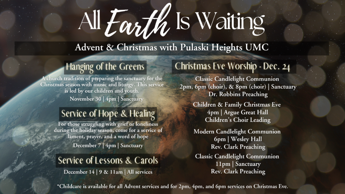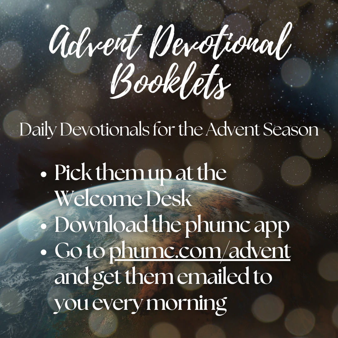 We’ve created an Advent Devotional Booklet to help you on your journey! Booklets are available now. You can pick one up at the Welcome desk, outside Wesley Hall, the PHUMC App, or call 501-664-3600 and we will mail you one! You can also get the daily Advent devotionals sent directly to your inbox by signing up at phumc.com/advent.