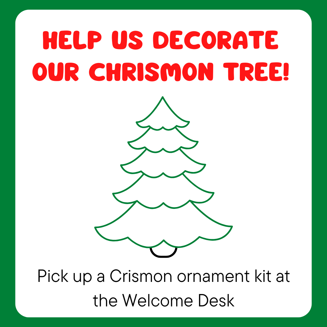 We invite families and individuals to help us decorate a Chrismon tree with ornaments for the season of Advent! The word “Chrismon” is a combination of the words “Christ” and “monogram.” The tree will be adorned with light and ornaments of white, gold, and silver—symbols of the life of Christ.