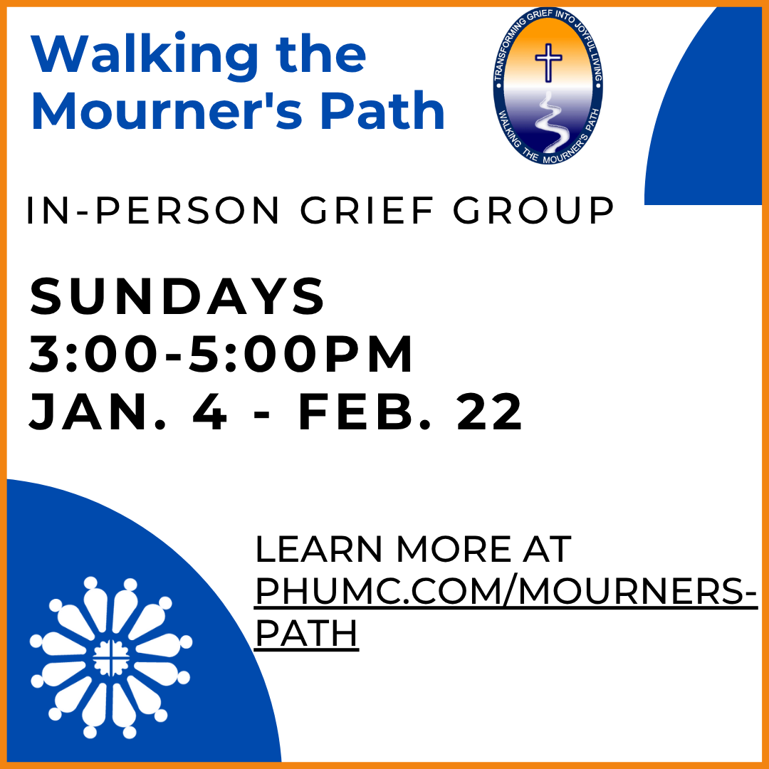 Walking the Mourner’s Path is an in-person grief group for anyone who has suffered a significant loss and would like to process it in a group setting. Our next group will be led by Rev. Belinda Price, Pam Hunter, and Lesa Booker. Through the 8-week program on Sundays, 3:00-5:00pm, January 4-February 22, mourners learn ways to honor their loved ones, seek spiritual direction, and discover God’s promise of comfort in community.