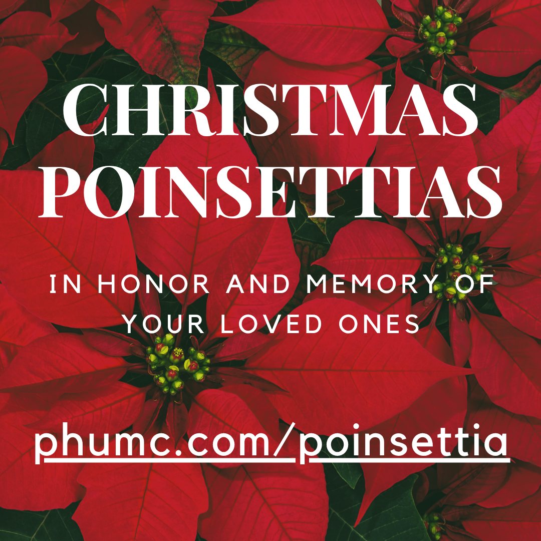 Christmas poinsettias ‘in honor of’ or ‘in memory of’ a loved one are available for $20 each, beginning October 26. They will be placed in the sanctuary during Advent and may be picked up after the 11:00PM Christmas Eve service or from the church on Dec. 29-31. Orders will close on December 14th and will be listed in the December 21st bulletin as well as the January Tower Newsletter. You can purchase them by going to phumc.com/poinsettia, calling the church office at 501-664-3600, or filling out the Poinsettia Form at the Welcome desk! Contact Theresa Smith at tsmith@phumc.com with any questions.
