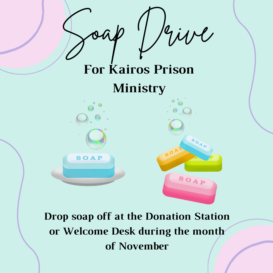 Our November Monthly Mission Collection will be soap for Kairos Prison Ministry. This soap will go to women at McPherson Women’s Unit. You can drop off soap at the Donation Station or Wesley Hall Welcome Area by December 1st.