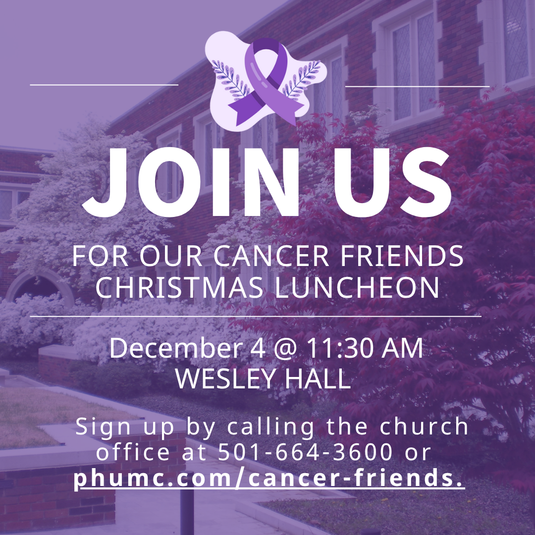RSVP by calling the church office at 501-664-3600, going to phumc.com/cancer-friends, or by filling out the Reservation book at the Welcome Desk.