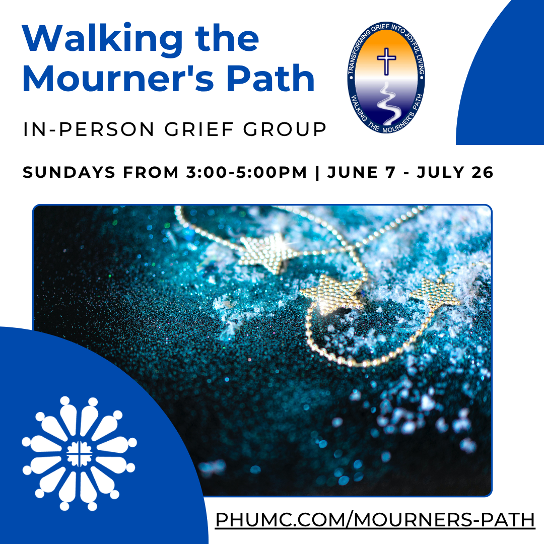 Walking the Mourner’s Path is an in-person grief group for anyone who has suffered a significant loss and would like to process it in a group setting. Please note, we recommend you be at least 3 months removed from the death of your loved one to be best served by this particular group.It is Christ-centered, scripturally and spiritually based. Through the 8-week program on Sundays, June 7-July 26, 3:00-5:00PM, mourners learn ways to honor their loved ones, seek spiritual direction, and discover God’s promise of comfort in the community!