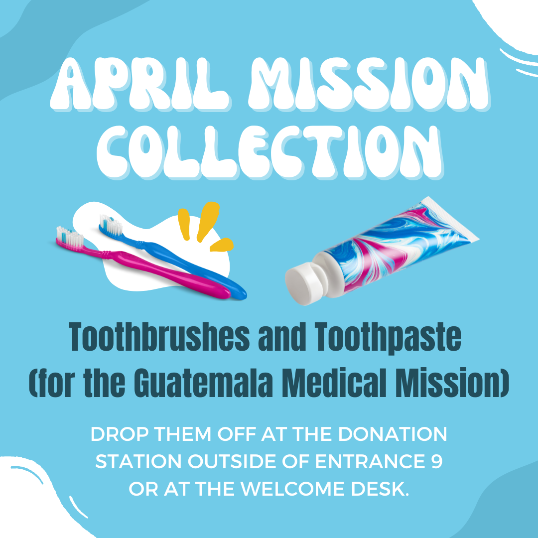 April's mission collection will be toothbrushes and toothpaste. Our Guatemala Medical Mission team will take these with them to distribute to those with whom we work at Salud y Paz. You can drop these items off at the Donation Station outside of Entrance 9, the Welcome Desk, or the collection bins around the church.