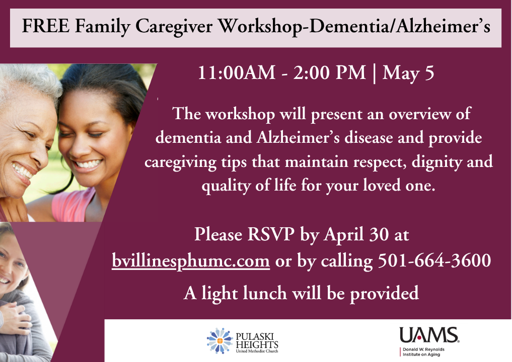 PHUMC, in partnership with UAMS, is hosting a free Family Caregiver Workshop on May 5 from 11am-2pm for those with family members who have Dementia/Alzheimers. The workshop will present an overview of dementia and Alzheimer’s disease and provide caregiving tips that maintain respect, dignity ,and quality of life for the person living with dementia. Information will also be presented on behavior and communication techniques, mental health resources, and activities for persons with dementia. A light lunch will be provided.