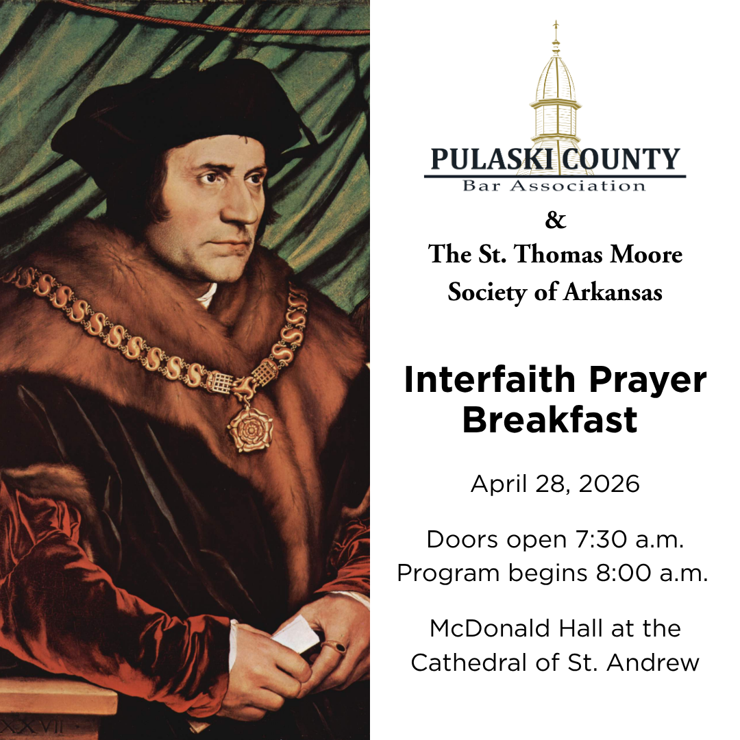 The Saint Thomas Moore Society of Arkansas and the Pulaski County Bar Association invite you to an Interfaith Prayer Breakfast on Tuesday, April 28, 2026, at McDonald Hall, Cathedral of St. Andrew, 617 Louisiana St., Little Rock. Doors open 7:30 a.m.; program begins 8:00 a.m. Free parking available in the lot west of McDonald Hall. This year’s theme is “Glorify God Among the Nations, Seeking Him in All Generations.” Clergy speakers include Fr. Daniel Velasco, Our Lady of the Holy Souls; Rabbi Barry Block, Congregation B'nai Israel; Rev. William Robinson, NLR First Baptist; and our very own Rev. Katye Chambers!