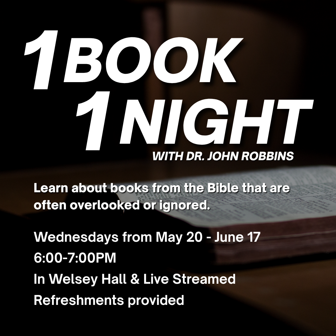 Starting May 20th to June 17th, join Dr. Robbins for his new bible study, One Book-One Night, and learn about books from the Bible that are often overlooked or ignored. It will be held from 6:00-7:00PM in Wesley Hall as well as live streamed. Refreshments provided!