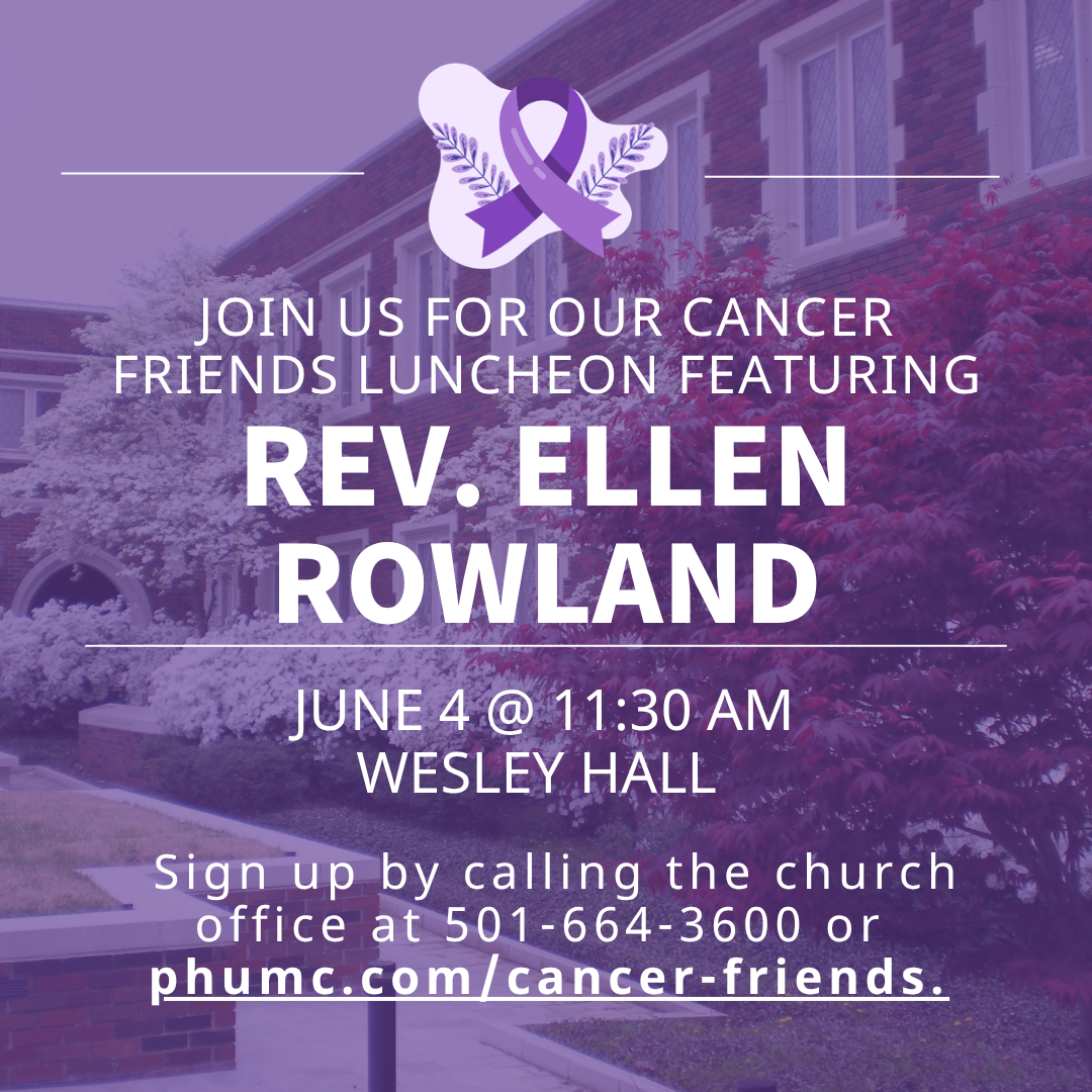 Join us for our Cancer Friends Luncheon on Thursday, June 4th from 11:30AM-1:00PM in Wesley Hall. We will eat a meal, listen to speaker Rev. Ellen Rowland, and remember those we have lost during the past year. Cost is $10 per person.
