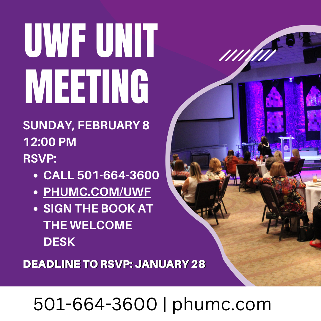 Join the United Women in Faith for our next church-wide unit meeting in the Parlor on Sunday, February 8 at 12:00pm. We will have lunch and a program. Cost for the meal is $10. RSVP by going to phumc.com/uwf, by calling the church office at 501-664-3600, or by signing the book at the Welcome Desk.