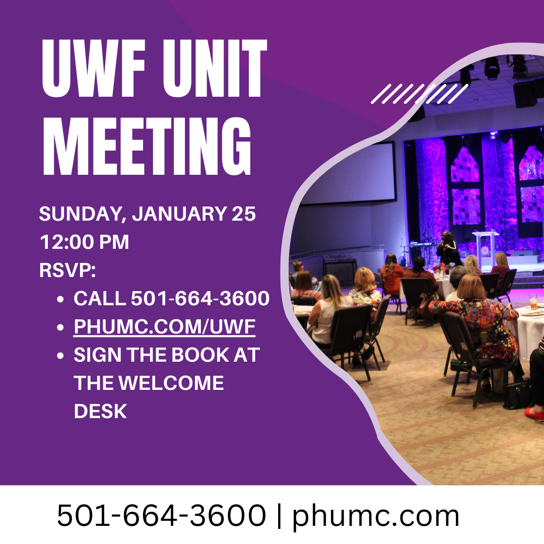 Join the United Women in Faith for our next church-wide unit meeting in the Parlor on Sunday, January 25 at 12:00pm. We will have lunch and a program. Cost for the meal is $10. RSVP by going to phumc.com/uwf, by calling the church office at 501-664-3600, or by signing the book at the Welcome Desk.