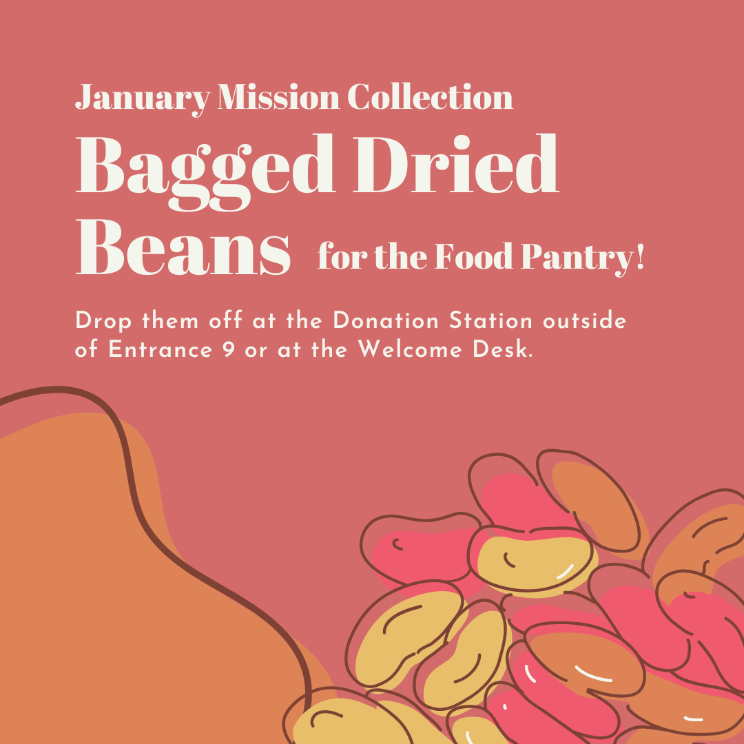 Our January Monthly Mission collection will be bags of dry beans for the PHUMC Food Pantry. You can drop off the beans at the Welcome Desk or the Donation Station outside of Entrance 9.