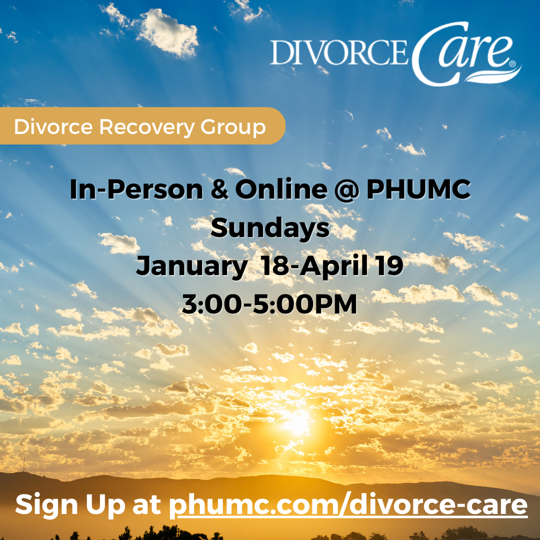 DivorceCare is a special weekly seminar and support group that will help you heal from the hurt. It’s a warm, caring environment led by people who understand what you are going through to learn practical steps to deal with the challenges of divorce. Best of all, you will gain hope for the future. PHUMC will have class on Sundays beginning January 18 from 3:00-5:00PM in-person and online. Questions? Contact Laurie Laing at lalcda@gmail.com or 501-664-3600 or go to phumc.com/divorce-care to sign up.