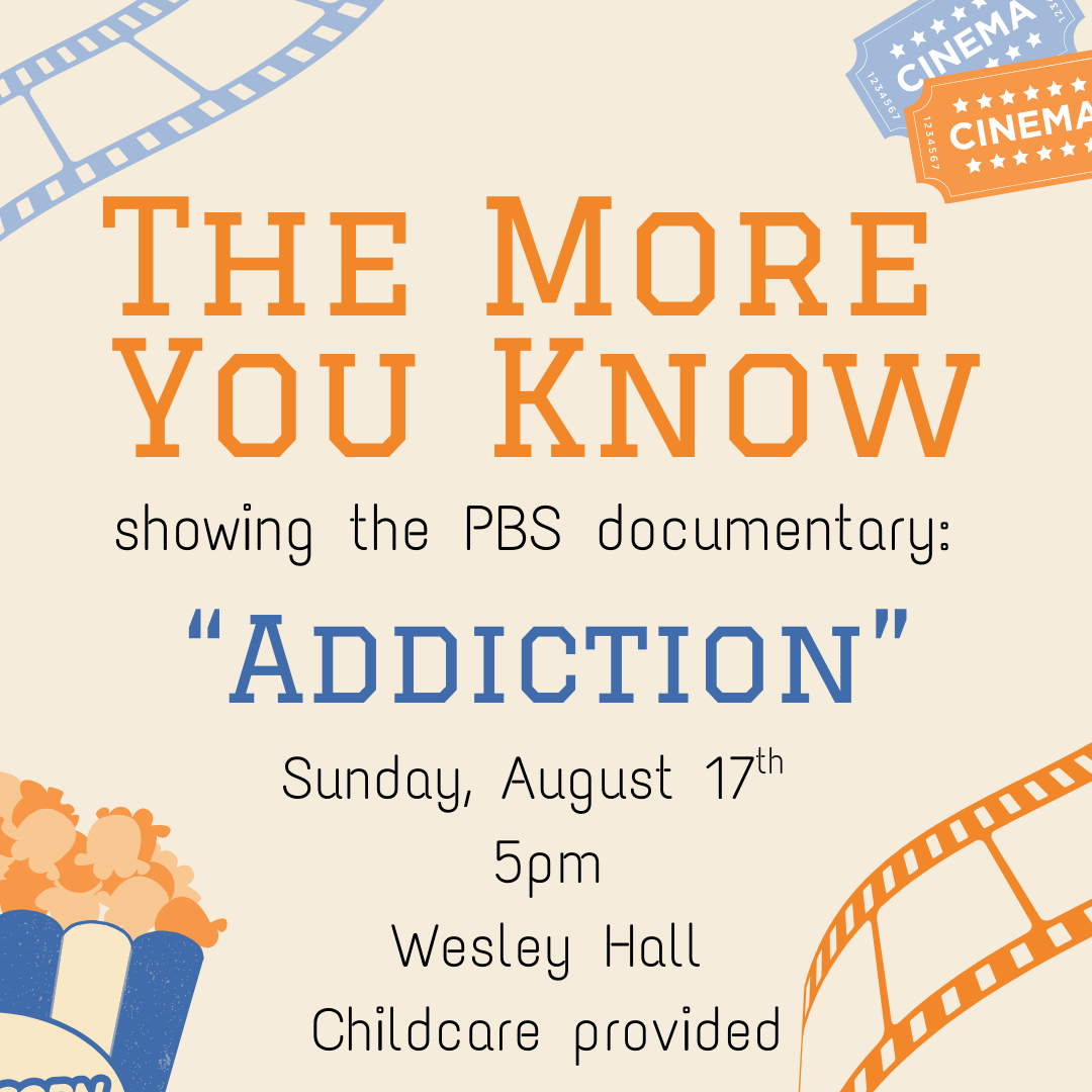 Please join us this Sunday, August 17th at 5:00pm in Wesley Hall for a powerful screening of "Addiction," a PBS NOVA documentary that takes an unflinching look at the science of substance use and recovery. Following the film, stay for a Q&A with Dr. Michael Mancino from UAMS and a Narcan training session. This event is being held in cooperation with the UAMS Center for Addiction Services and Treatment. Childcare is provided. Questions? Contact Rev. Katye Chambers at kchambers@phumc.com.