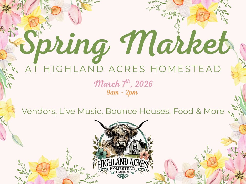 | | This is our 9th Annual CASA 5K Race and Fun Run. Our unique loop running course in Temple was voted “Best 5K Route” last year by our race participants. Come run our fully paved, well-marked, and measured route on Saturday, March 7th. The route is excellent for serious runners as well as those who enjoy supporting a great cause with a fun run. This is a chip-timed race with official results. In addition to all of the running prizes for the various age categories, our race includes prizes for “Best in Theme” dressed runners, largest club/group participation prize, youngest and oldest runners, and an award for the runner that travels the farthest to participate. Have fun and support CASA of Bell and Coryell Counties – join us on Saturday, March 7th as we run for CASA! | | Come join us for the first market of the year at Highland Acres! Amazing vendors, delicious treats, fluffy animals, live music and fun for the whole family! | | |