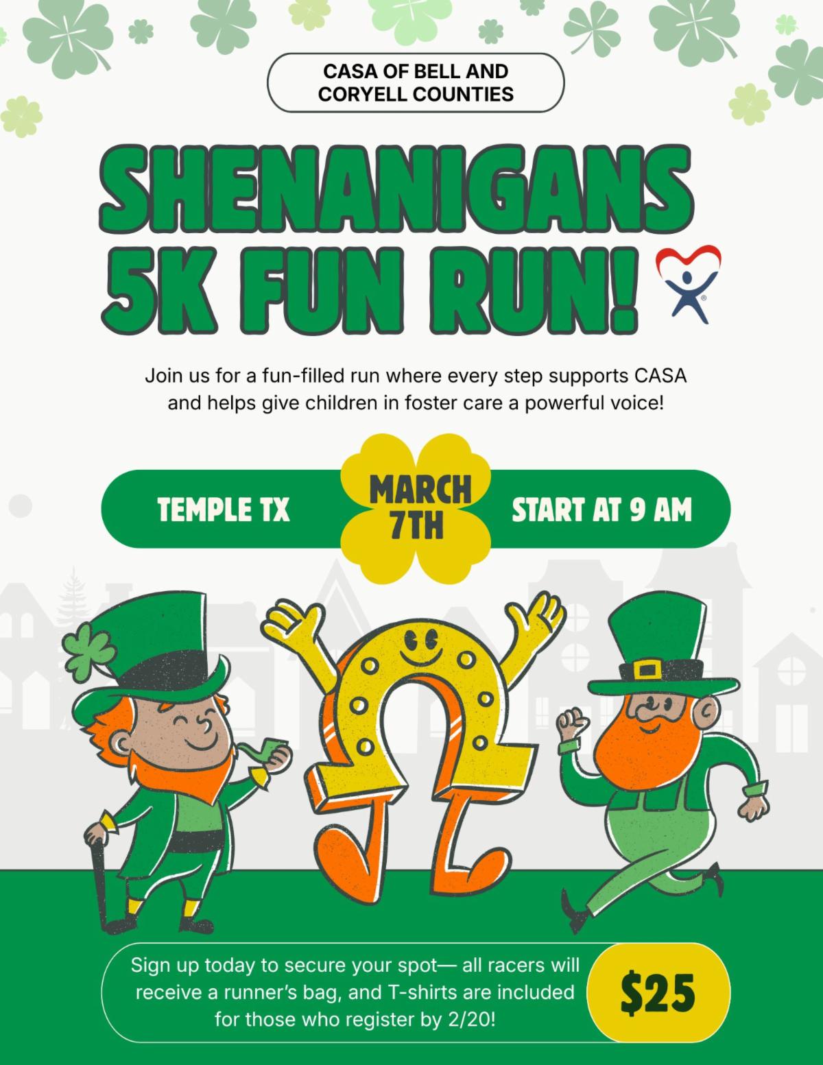 | | This is our 9th Annual CASA 5K Race and Fun Run. Our unique loop running course in Temple was voted “Best 5K Route” last year by our race participants. Come run our fully paved, well-marked, and measured route on Saturday, March 7th. The route is excellent for serious runners as well as those who enjoy supporting a great cause with a fun run. This is a chip-timed race with official results. In addition to all of the running prizes for the various age categories, our race includes prizes for “Best in Theme” dressed runners, largest club/group participation prize, youngest and oldest runners, and an award for the runner that travels the farthest to participate. Have fun and support CASA of Bell and Coryell Counties – join us on Saturday, March 7th as we run for CASA! | | |