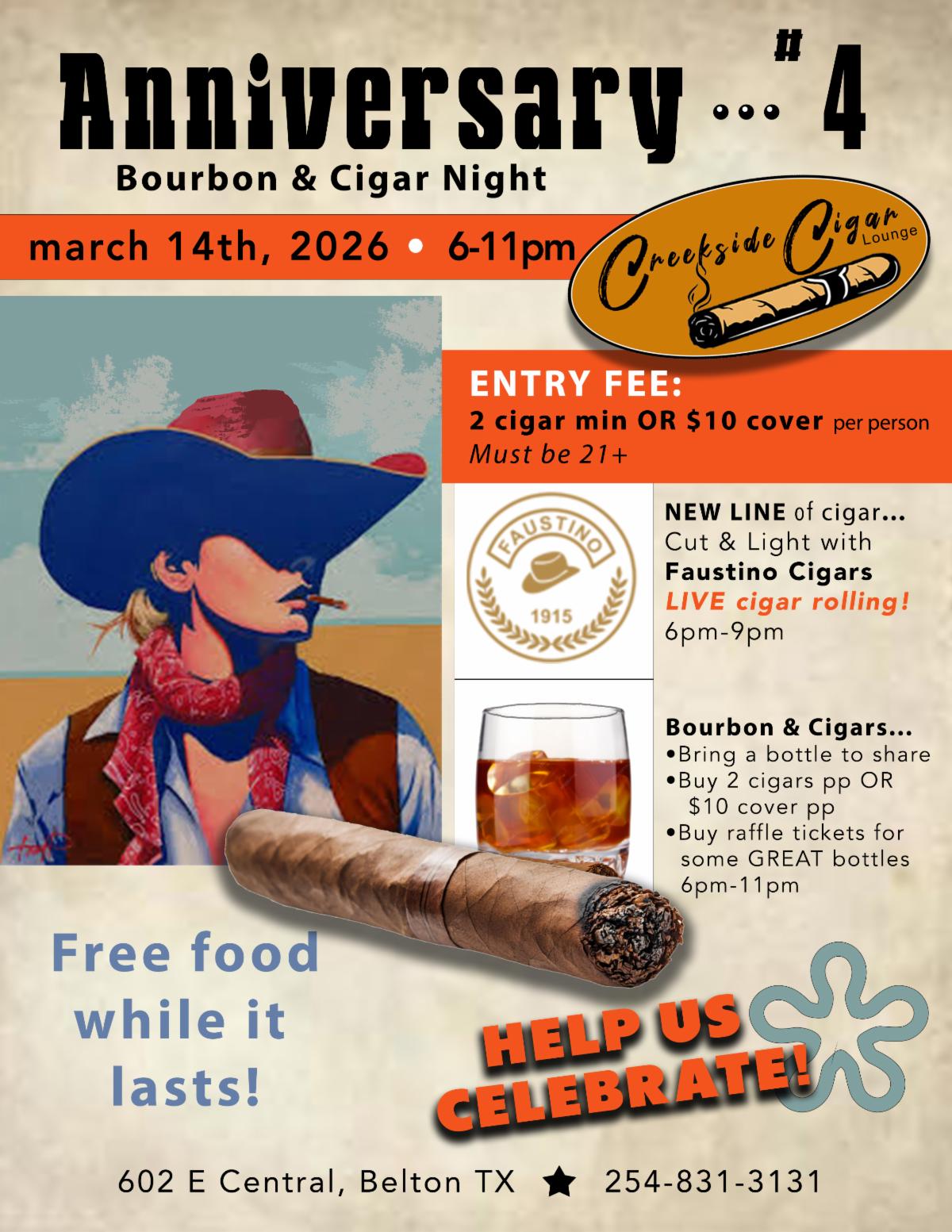 Help us celebrate 4 yrs of business! We are having a cigar & bourbon night. Must be 21+ and buy 2 cigars pp or a $10 cover pp. Cigar Cut & Light with Faustino Cigars. This is a new line we brought into our humidor. They are bringing their roller who will be doing live demonstrations of rolling cigars!