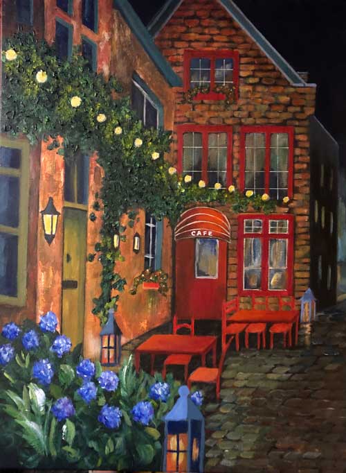 Cynthia did a fantastic job on her painting of "Restaurant in Bruges," and she just needed to make small tweaks to end up with a masterpiece.