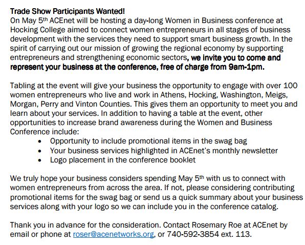 If you have any questions about ACEnet's 2017 Women in Business conference, please contact Erin Phillips at erinp@acenetworks.org or 740-592-3843, ext. 111