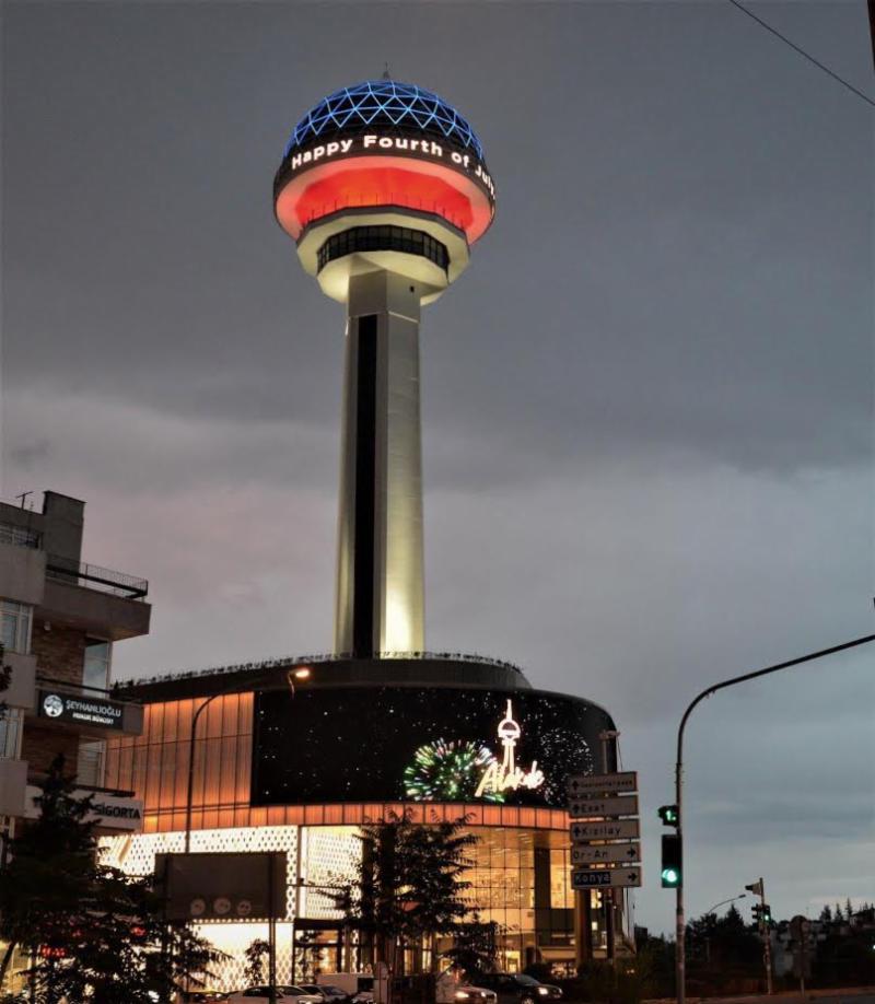 Atakule tower in Ankara displaying a Happy Fourth of July greeting