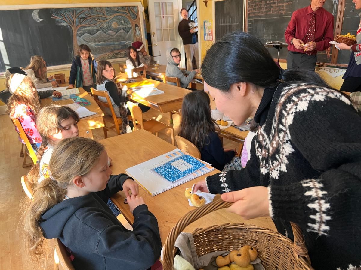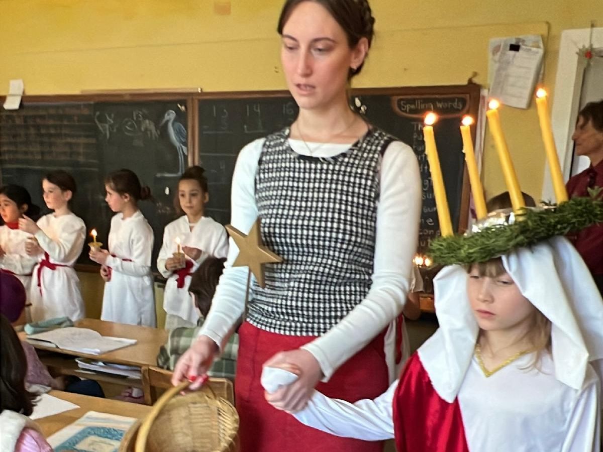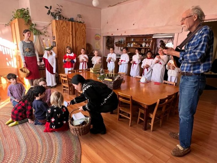 Ms. Neel's second graders – accompanied by Mr. Steve Bernstein on the mandolin –led the school in the Santa Lucia celebration, honoring this traditional Festival of Light from the Waldorf calendar. They processed through the school singing and bringing brightness and warmth to each classroom. This festival, celebrated on what was once the Winter Solstice under the Julian calendar, reminds us that even in the longest nights, beauty and warmth prevail. The children carried this living tradition with dignity and joy. Thank you to the parents who baked and delivered lussekatter – the traditional Swedish saffron buns – to every classroom, adding sweetness and authenticity to this beautiful celebration.