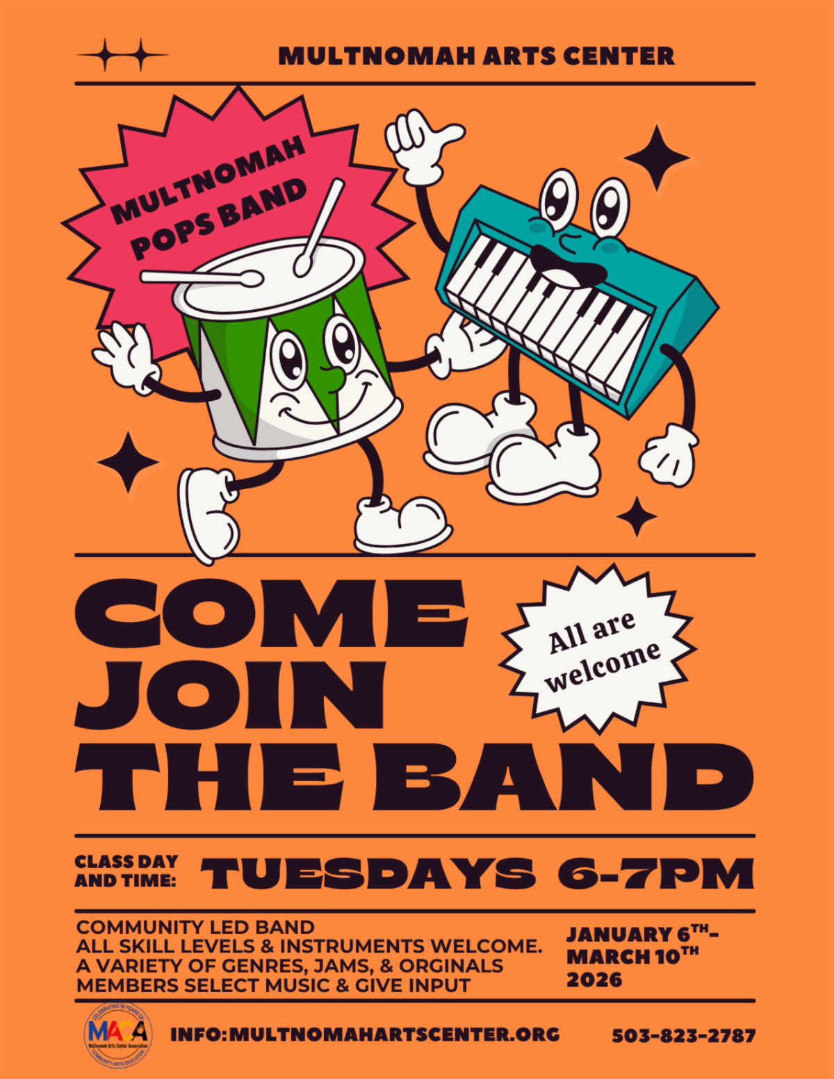 You're invited to join the band! All instruments and all skill levels are welcome. Led by MAC Performing Arts Lead Kelly Mason, band members will learn how to jam and play songs from modern pop and hip hop to rock classics. Enjoy playing alongside others in this friendly, welcoming community band setting. All levels of experience and all instruments (including guitar and drum set) are welcome. The instructor may have instruments to loan if needed!