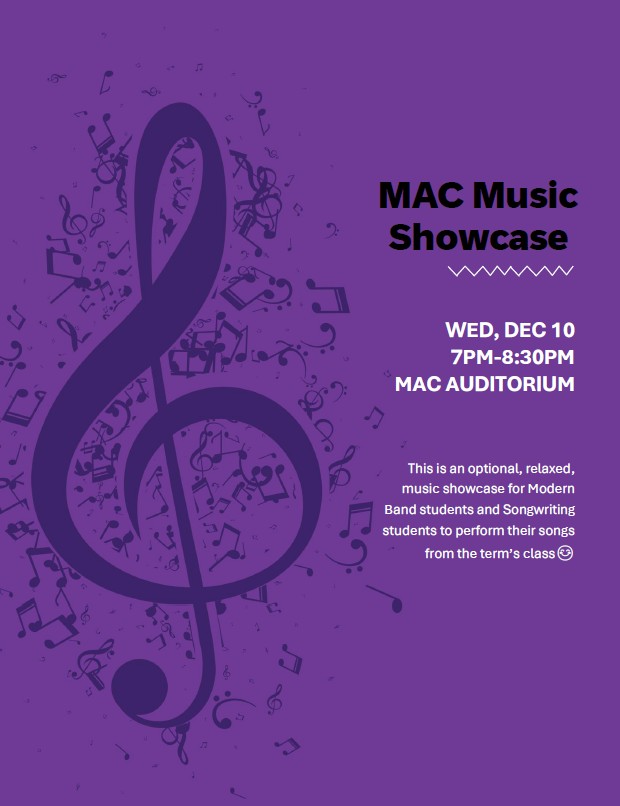 You are cordially invited to a music showcase being put on by some of MAC's newest music ensembles and classes! Featuring performances from Modern Band and original works by Songwriting students, come enjoy music and connect with others in a relaxed atmosphere.