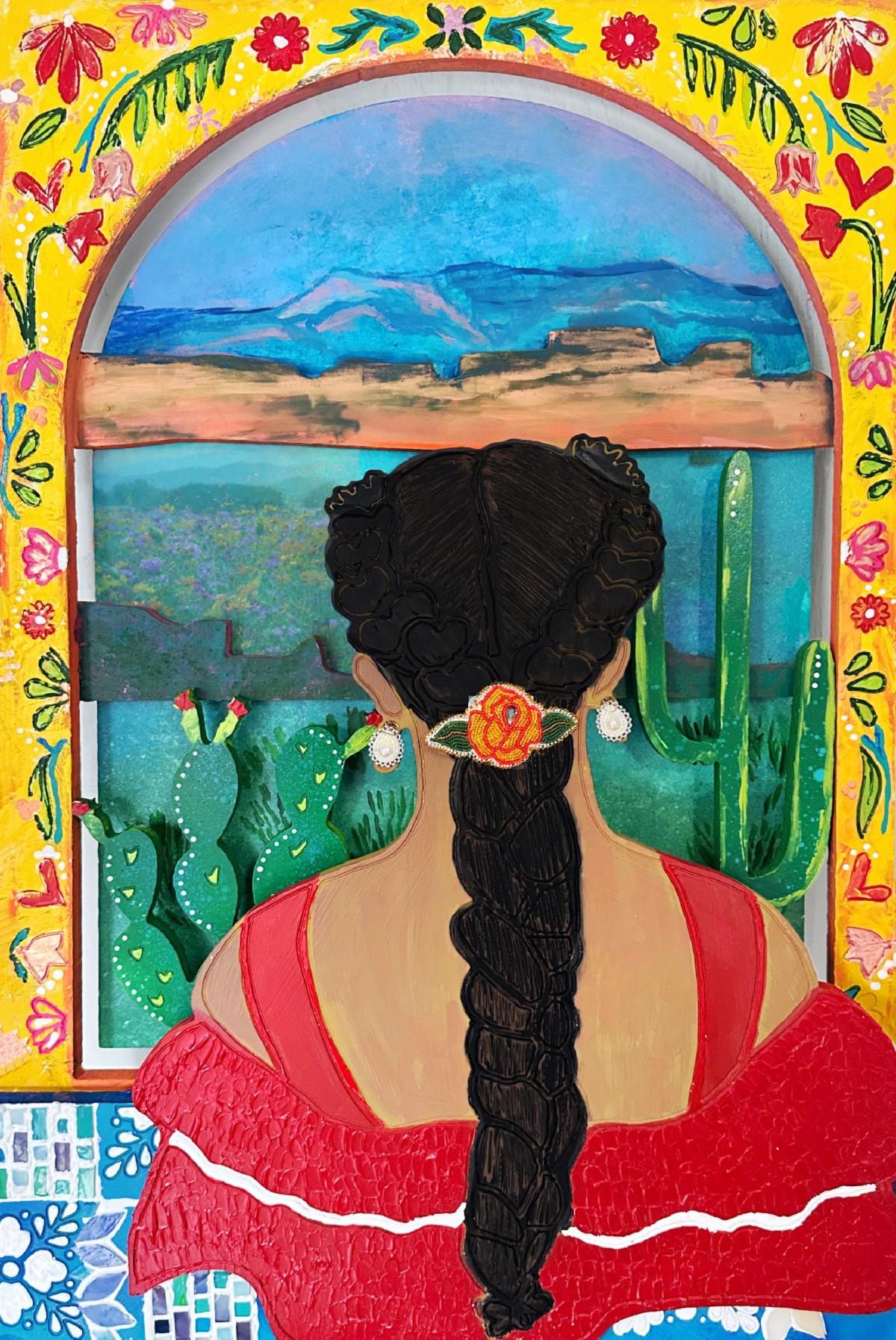 Marilyn Cisneros is a Yaqui-Mexican-American artist who works primarily in mixed media, papier-mâché and hojalata tin art, a traditional Mexican craft. “I am drawn to the ways culture, community, and nature intersect in the maternal journey, and I use my work to highlight both the resilience, and the vulnerability found in caregiving.”