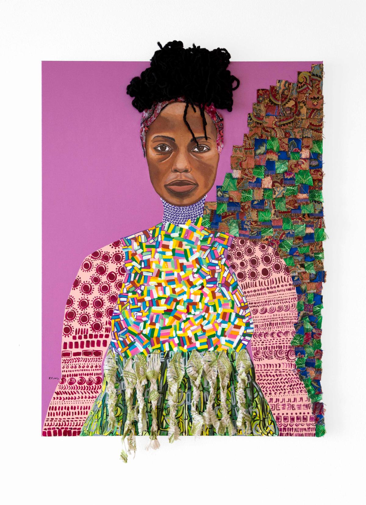 Latoya Lovely is a mixed media artist who focuses on storytelling through her art. “I’m greatly inspired by South African Artist and hair stylist, Lebohang Lang Motaung, through her use of synthetic hair.” Lovely’s work addresses “colorism, a form of racism where those with lighter skin and European features are given preference over those with darker skin; and texturism, which is the discrimination against people with kinkier, coarse hair within the same race.”