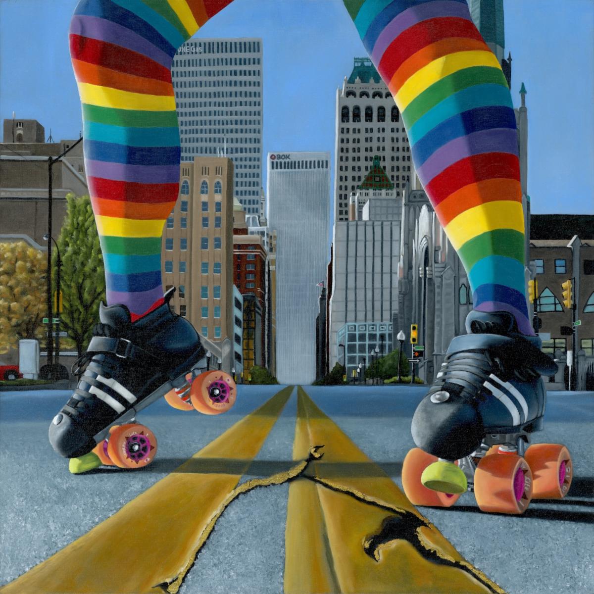 Stephanie Anderson is an oil painter. She experienced a life-altering medical diagnosis in 2015 that reshaped her sense of self. “Soul City is a collection of oil paintings inspired by her previous #msskateproject photograph series. It represents a deeply personal evolution that bridges fear, grief, healing, identity and resilience. I use oil on canvas to merge my beloved Roller Derby subculture with a fine art form.”