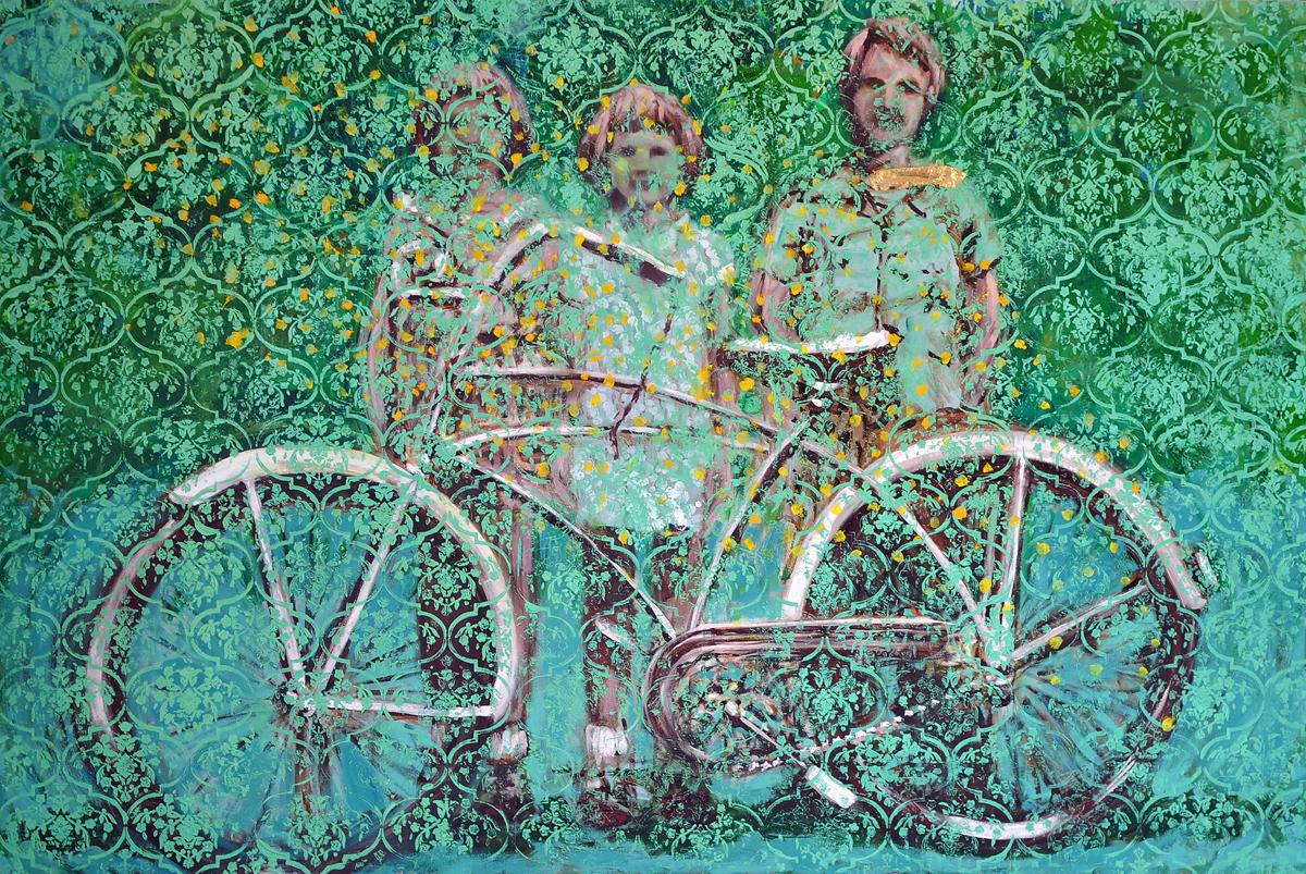 Joy Kloman creates paintings that combine both figurative and abstract or patterned elements. “My artistic practice is an exploration of temporality. The sourced vintage photographs referenced in my art are a black and white record of days that have passed. In my figurative paintings, I have added color and a fluorescent underpainting, creating tension between past and present.”