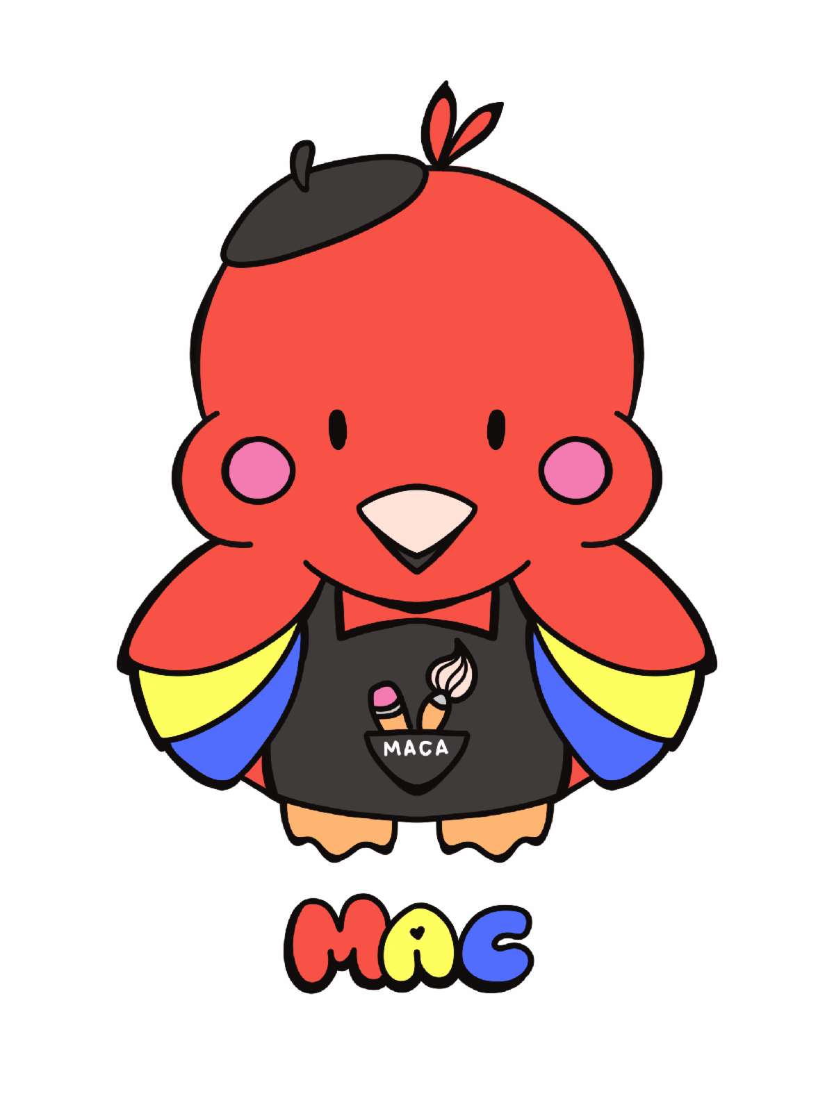 Meet Mac! Mac is MACA’s new mascot! Mac is a scarlet macaw with vibrant, primary-colored plumage that matches their creative personality. Mac stickers are now available from the Front Desk with any MACA donation of $1 or more in support of our Community Engagement programming to continue bringing the arts to all. Keep an eye out in the future for limited edition Mac stickers for special community events and holidays!