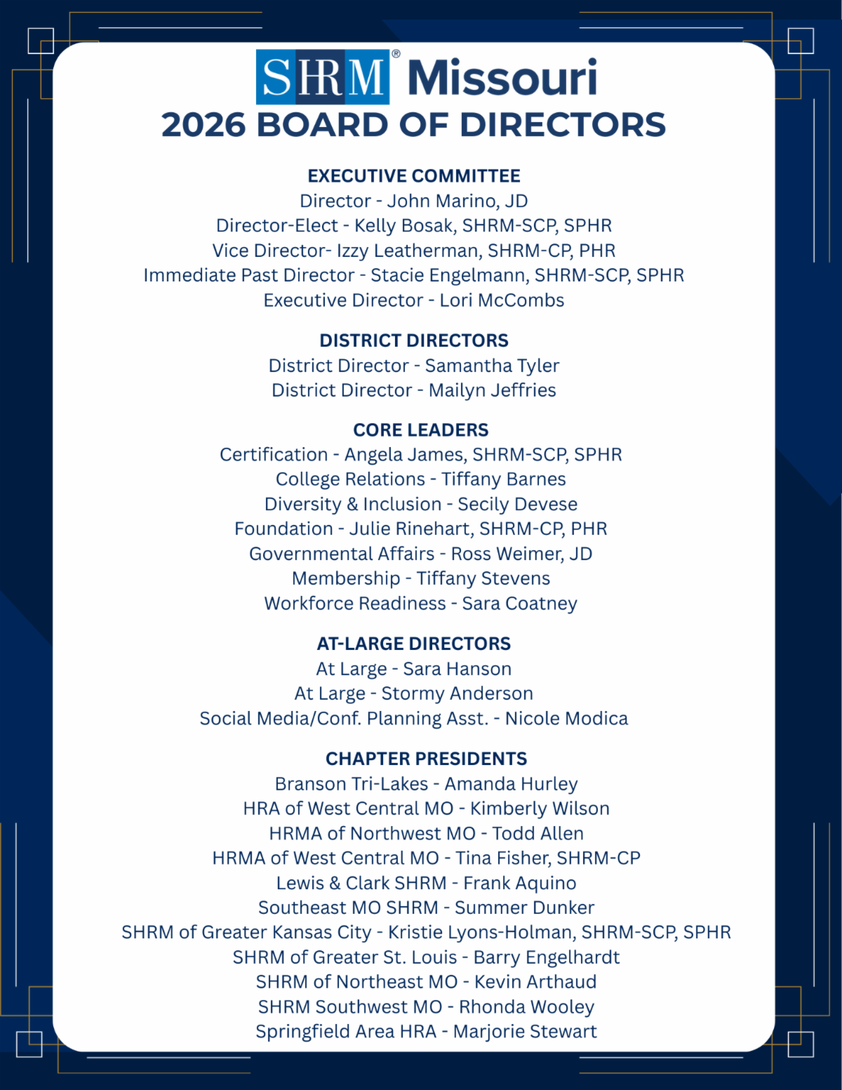 | | | Congratulations to the 2026 Missouri SHRM State Council Board of Directors | | |